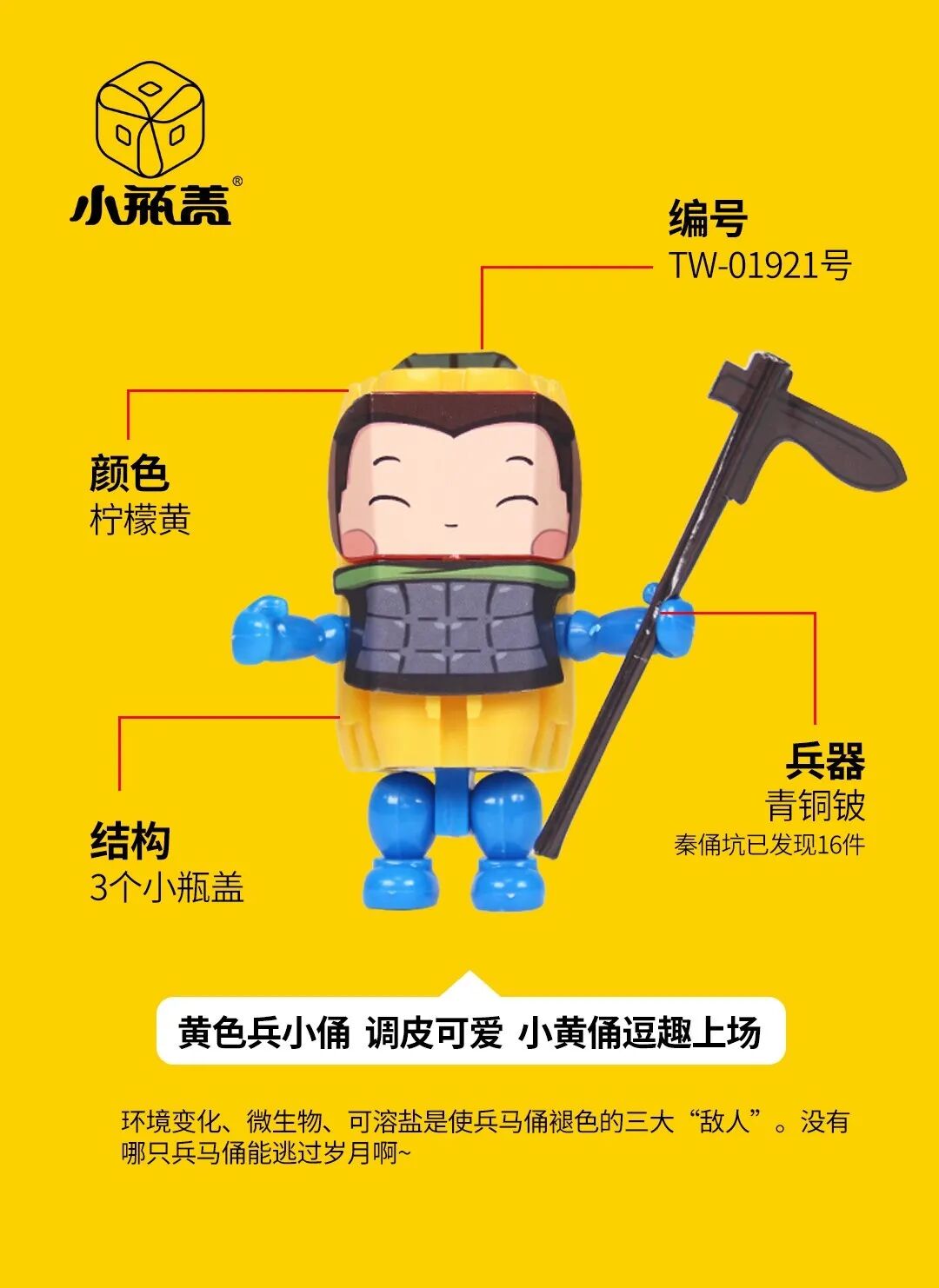 就这样,在小瓶盖插画大师个人喜好的各种涂鸦过程中,小瓶盖公仔的瓶盖脸逐渐形成,一只叫“兵小俑”的家伙就这么横空出世了……